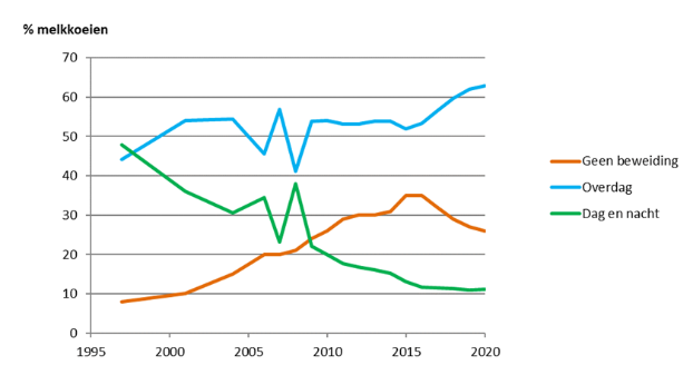 Percentage weidende bedrijven (Duurzame Zuivelketen, 2020) en percentage melkkoeien met dag- en nachtbeweiding, dagbeweiding en geen beweiding (CBS, 2021)