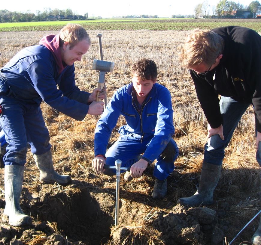 Met behulp van een grondboor worden door de studenten ook de diepere bodemlagen onderzocht